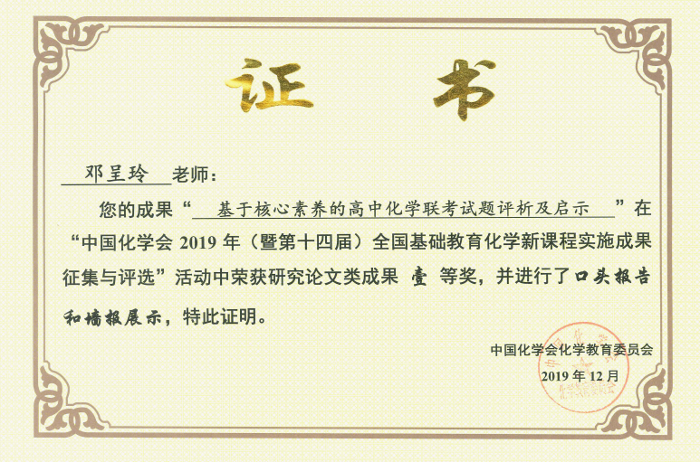 12月6日-12月8日,由中国化学会主办,中国化学会化学教育委员会、北京师范大学化学学院化学教育研究所、《化学教育(中英文)》杂志、山东省潍坊市昌乐县第一中学承办的“第十四届全国基础教育化学新课程实施成果交流大会”在山东省潍坊市隆重举行。必赢线路检测中心学科教学(化学)教育硕士研究生邓呈玲同学获研究论文类成果一等奖并做头口报告和墙报展示;邓洁兰同学获研究论文类成果二等奖1项、教学案例类(教学课件)成果二等奖1项、习题和试题设计类成果三等奖1项。