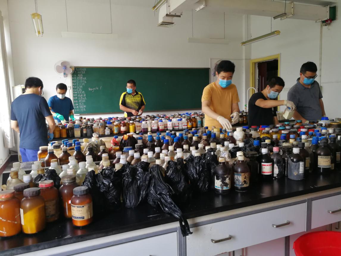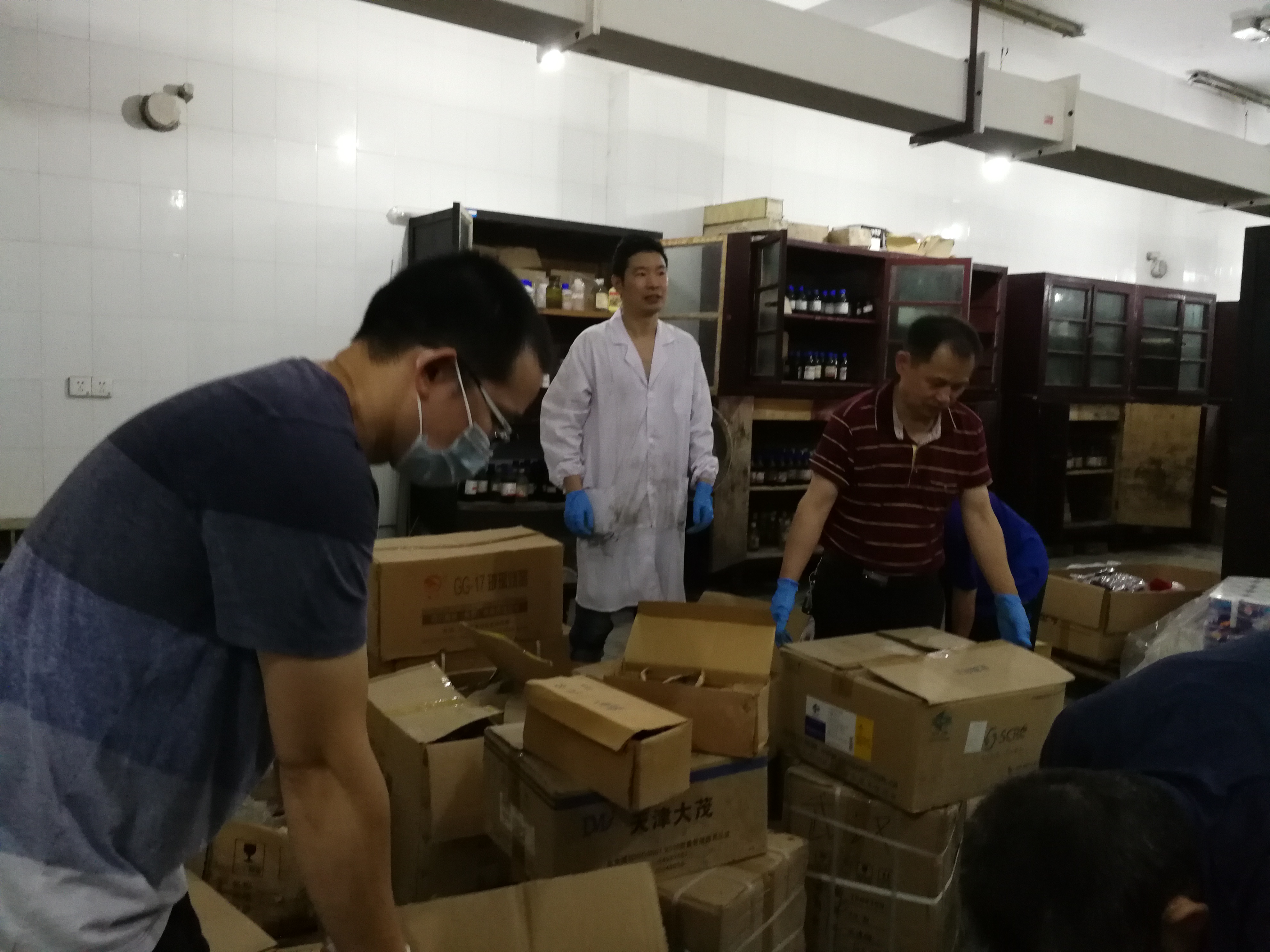 危化品是需要合适的温度,从地下室搬上楼的危化品已经4天了,担心温度高会引起爆炸,学院组织老师将搬上来的危化品进行清理分类,并向校领导汇报,要求架设一条专用电线,确保危化品实验室空调能启动。学校领导十分的关心化学楼上危化品的安全,多位领导前来指导,并迅速协调开通专线为药品室供电降温。