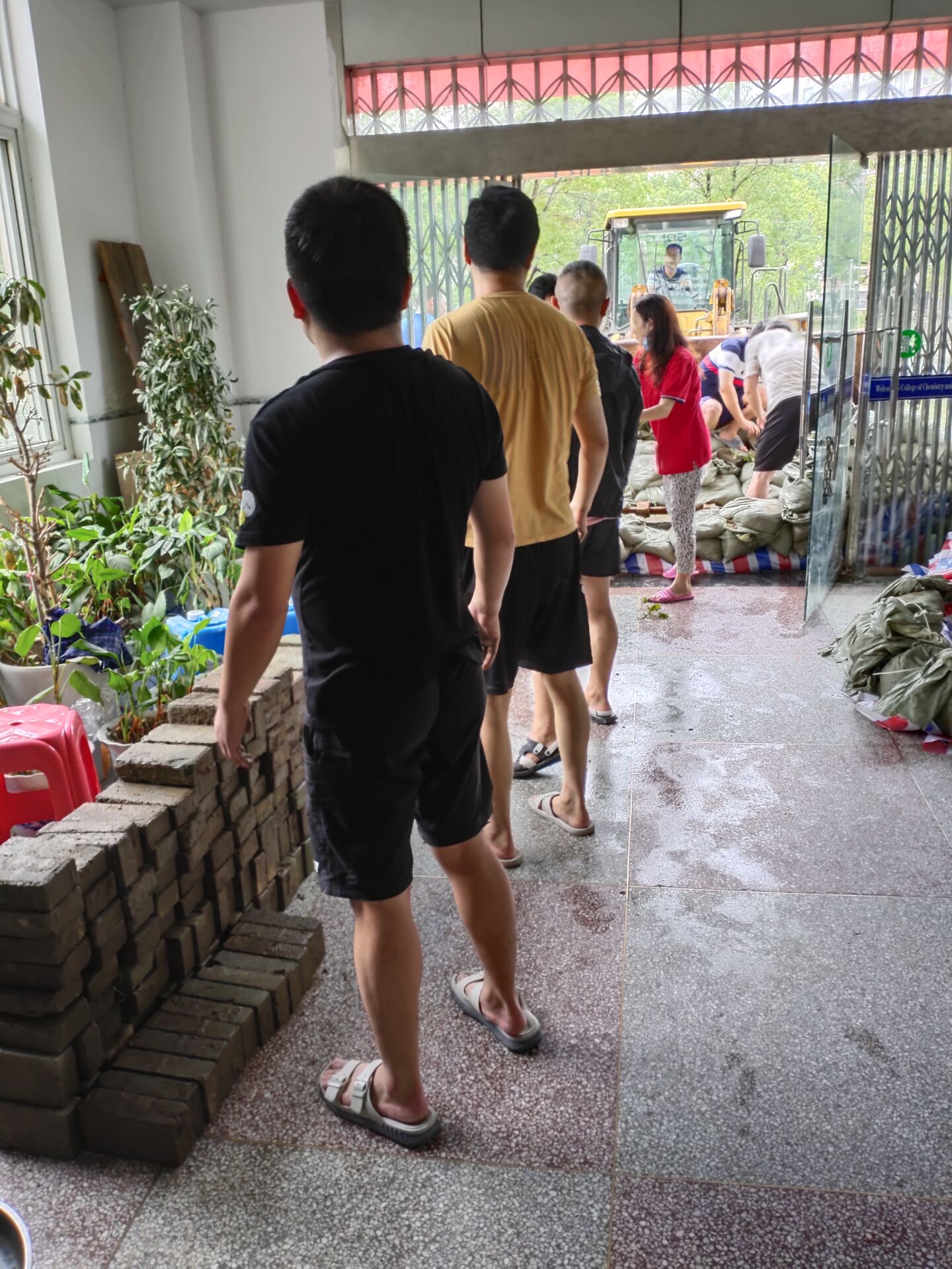 学生宿舍进水了,学院紧急组织班子成员和徐涛、林军奇等6名班主任老师对学生宿舍一楼的学生物品进行整理和抬高转移,在老师们的努力下,一楼学生的物品基本没有损失。