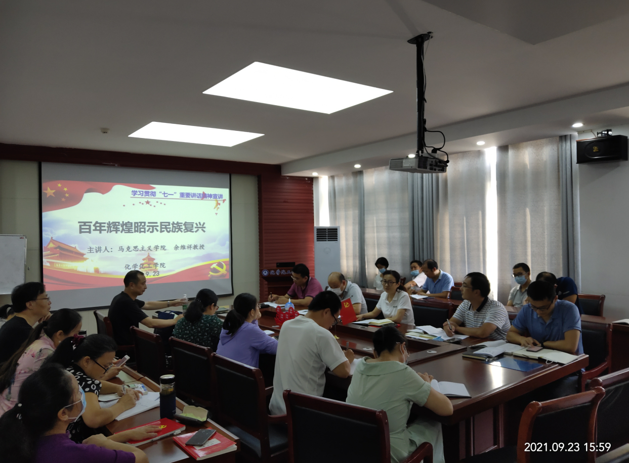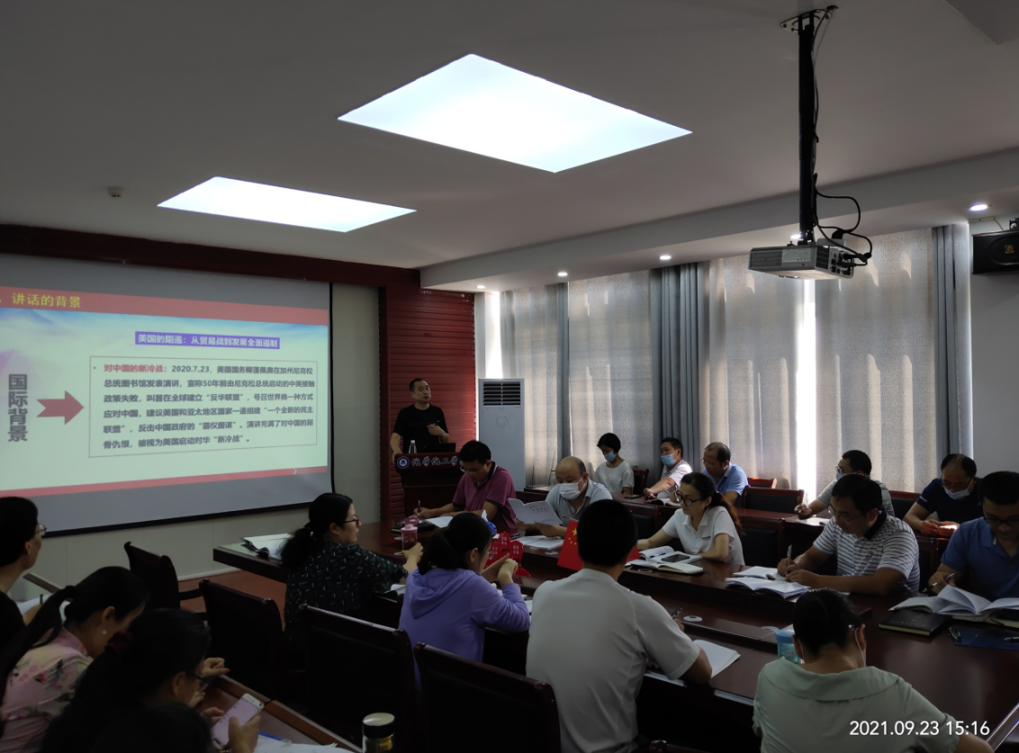 我院党史学习教育理论专家宣讲团成员、马克思主义学院余维祥教授以《百年辉煌昭示民族复兴》为题做了专题宣讲。余教授从“七一”讲话的国际国内背景、“七一”讲话的框架结构、“七一”讲话提出的新思想、新观点、新要求和全面贯彻落实讲话精神四个方面进行辅导,“七一”讲话闪烁着马克思主义真理光芒,是新时代中国共产党人的政治宣言,是实现第二个百年奋斗目标的行动纲领。从党的百年奋斗历程,我们深深体会到了“中国共产党为什么能?中国特色社会主义为什么好?马克思主义为什么行?”大家纷纷表示要坚定听党话跟党走,全面贯彻落实讲话精神,为党育人,为国育才,为中华民族伟大复兴贡献力量!