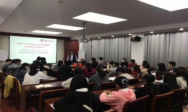 近日,我院特聘教授,香港浸会大学教授,博士生导师,国际催化化学界著名学者,英国皇家学会院士,亚太催化协会创始成员,中国催化委员会成员,“Applied Catalysis A:General”主编区泽堂教授于我院化工楼407给全院师生开展了为期8天的系列讲座。讲座围绕“写好英文论文,国际期刊投稿准则,如何回应审阅者的评论,Numbers and units,主语动词单复数一致性,英式及美式英文,正确使用连字符,如何选择论文论题“等内容展开。