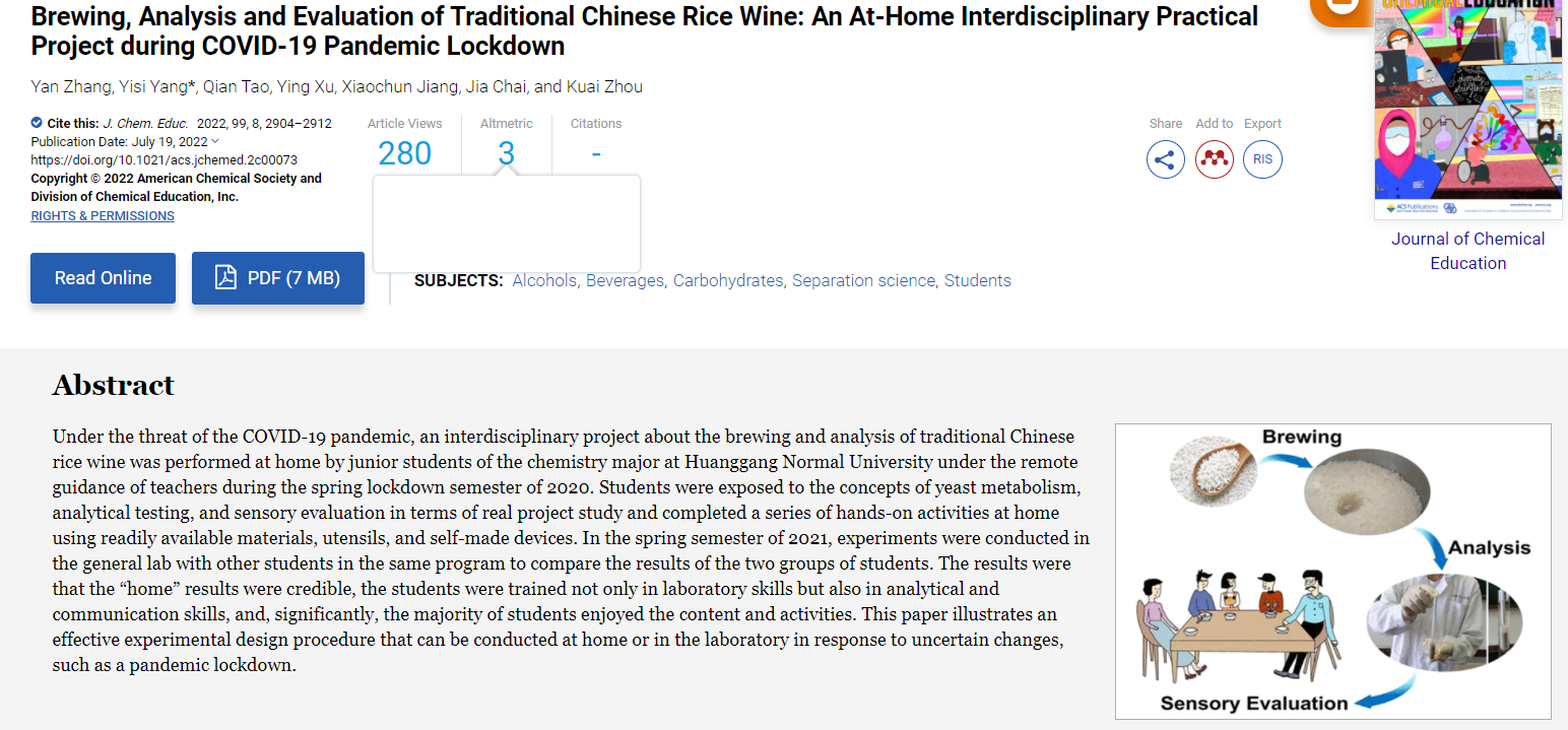 近日,必赢线路检测中心张龑、杨一思老师在化学教育类国际顶级期刊《Journal of Chemical Education》上发表了题为《Brewing, Analysis and Evaluation of Traditional Chinese Rice Wine: An At-Home Interdisciplinary Practical Project during COVID-19 Pandemic Lockdown》的教学研究论文(J. Chem. Educ. 2022, 99, 8, 2904–2912. DOI: https://doi.org/10.1021/acs.jchemed.2c00073),必赢线路检测中心为唯一完成单位。这也是继2021年两位教师在《Journal of Chemical Education》发表我校首篇化学专业教学研究SCI期刊论文后的第二篇论文。