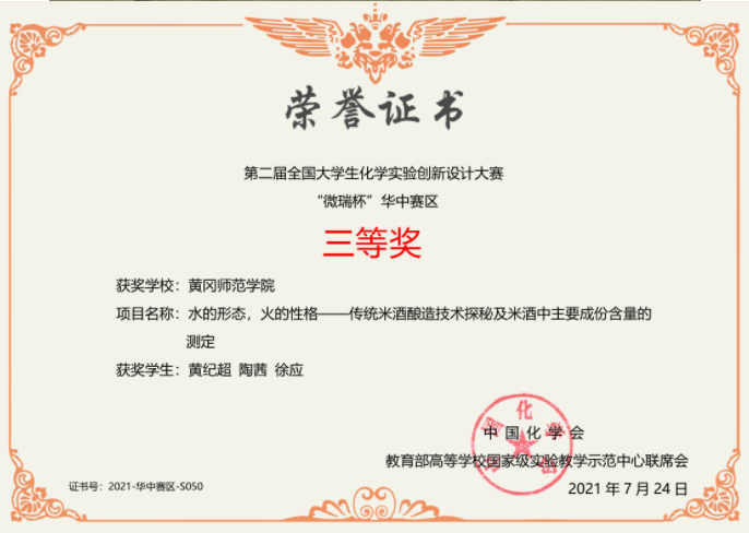 必赢线路检测中心一直以来十分重视本科教学改革工作,支持和鼓励教师开展教学研究和探索。张龑、杨一思老师注重教学观念、教学内容的创新,将中学化学的知识点与综合实验活动相结合,开展了一系列项目化学习(PJBL)的教学活动,从2019年开始,在化学专业的中学化学实验教学指导课中开设了“传统米酒酿造技术探秘及米酒中主要成分含量的测定”的实验,创新了米酒有效成分的测定方法和实验方案,学生既可以实验室中利用专用仪器完成实验,又可以居家利用日常工具做实验。通过三年的教学实践摸索和总结,发表了相关文章,在新冠疫情常态化的今天,该实验教学成果具有很强的实用价值。两位老师还指导学生根据该实验项目参加了2021年第二届全国大学生化学实验创新设计竞赛科普类赛道,获得华中赛区三等奖。