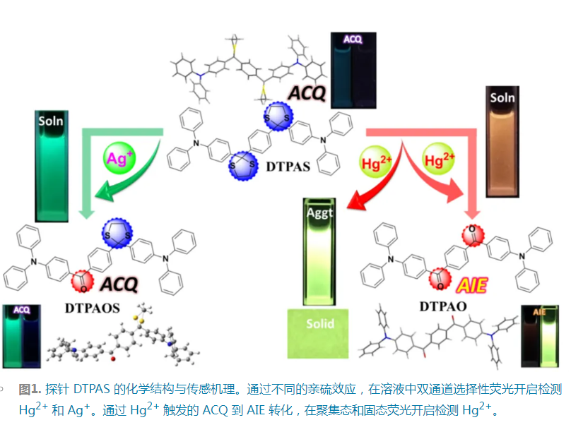 通过晶体结构分析和理论计算,详细探索了所涉及分子相反发光性质的起源,即 DTPAO  AIE 活性,而其硫醇保护产物的 ACQ 特性,有助于更好地理解 AIE 发光机制。同时,Hg2+ 触发的 ACQ (DTPAS)  AIE (DTPAO) 转化可以在数秒钟内完成,也为 ACQ  AIE 分子的转化提供了一种简单的方法。