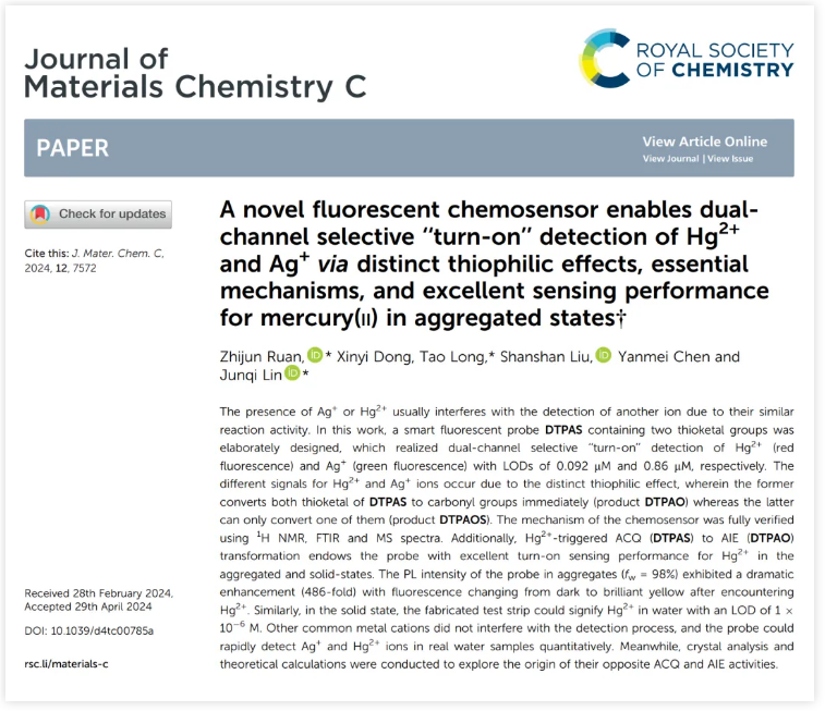 本研究不仅为复杂系统中多种分析物的检测提供了一种有效的方法,而且为化学传感器的设计提供了一个满意的平台,即分析物触发的 ACQ-AIE 转变。该成果以A novel fluorescent chemosensor enables dual-channel selective “turn-on” detection of Hg2+ and Ag+via distinct thiophilic effects, essential mechanisms, and excellent sensing performance for mercury(II) in aggregated states(《一种新型荧光化学传感器通过可区分的亲硫效应实现对 Hg2+  Ag的双通道选择性“开启”检测、详细机理及其聚集态对汞(II)优异的传感性能》)为题,发表在英国皇家化学会期刊 Journal of Materials Chemistry C 上,并入选为 hot article